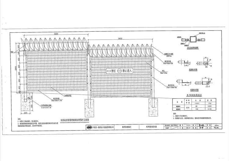 3、围栏立柱、支架、网片、边框、连接板采用连续热浸镀锌浸塑复合涂层,铁丝、刀片滚笼、螺栓采用热浸镀锌涂层,所有钢材均采用Q235低碳钢,具备抗腐蚀、抗紫外线能力,使用寿命不低于15年。