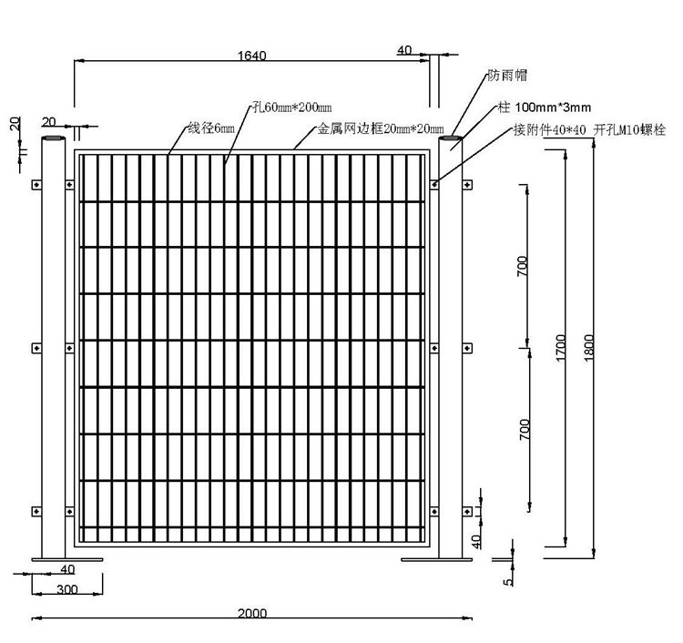 3、网片是由6mm钢筋、20mm*20mm金属网边框、接附件组成。