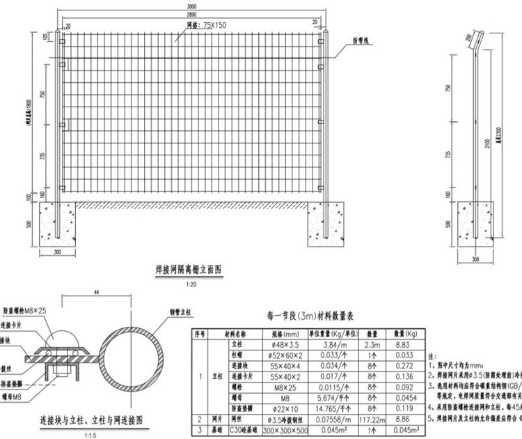 2、焊接网隔离栅网片采用Φ3.5(防腐处理前)冷拉钢丝焊接而成,金属外露部分均浸塑。