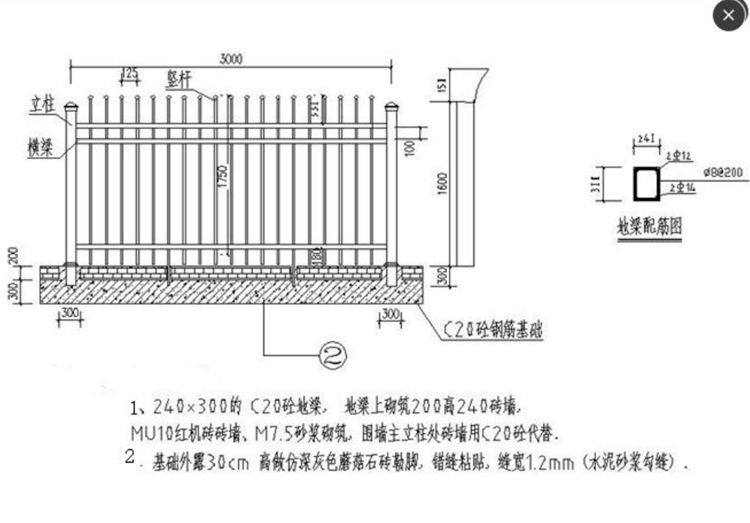 5、锌钢护栏围栏固定方式:主立柱在浇筑砼基础时一并埋入砼中 300 深(立柱总长 1.9 米),单片围栏要有 2 条竖条加长埋 入砼中(加强抗风性)。
