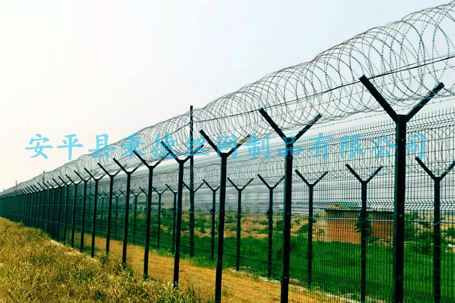 6、图中机场钢筋网围界上部刺笼形式为无边框斧形刺刀圈构造。