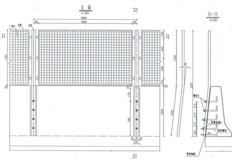 3、桥梁防落物网立柱安装在钢筋混凝土护栏上,用预埋螺栓加以固定。
