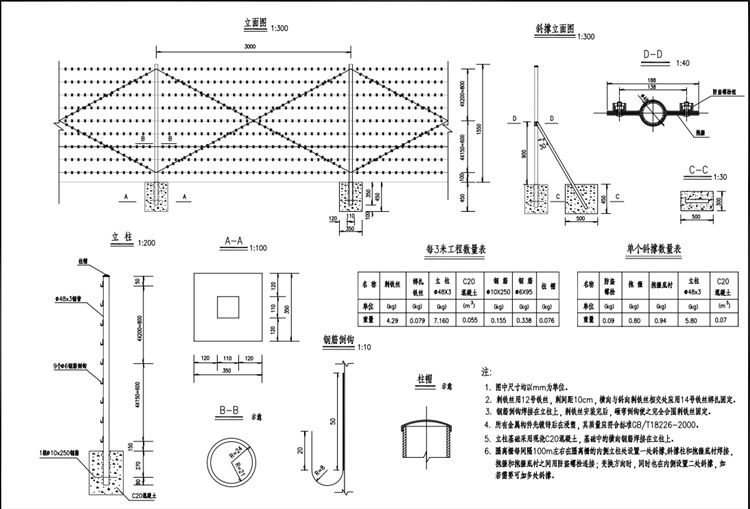 5.刺铁丝隔离栅立柱基础采用现浇C20混凝土,基础中的横向钢筋焊接在立柱上。