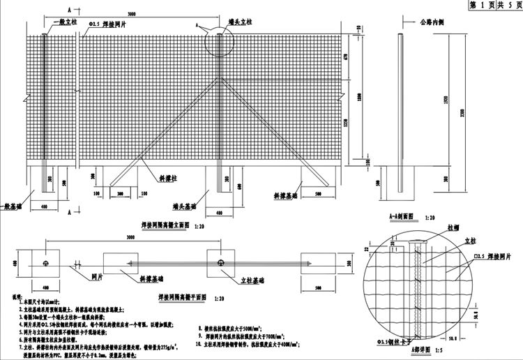 焊接网隔离栅由立柱、网片、斜撑柱及紧固件等组成。焊接网隔离栅立柱采用燕尾柱,其中端头立柱由60*2.0mm的焊接钢管加工制成,一般立柱和拐角立柱由48*1.5mm焊接钢管加工制成;隔离栅斜撑柱采用38*1.5mm焊接圆钢管,焊接网由2.5mm低碳钢丝焊接而成,网孔尺寸为101.6*50.8mm。每一卷焊接网的长度为30m。焊接网的立柱间距为3.0m,每隔30m设置一个端头立柱,并配合设置两个斜撑柱,凡拐角处、封头处均应采用拐角立柱并设置横向斜撑柱。焊接网隔离栅立柱、斜撑、网片均采用“热浸镀锌浸塑复合涂层”的防腐处理方式,热浸镀锌浸塑复合涂层由热浸镀锌内涂层和流化床浸塑外涂层组成。立柱、斜撑镀锌量不小于275g/㎡,网片镀锌量不小于90g/㎡。螺栓、螺母、垫圈等紧固件采用直接热浸镀锌的防腐处理方式,镀锌量不小于350g/㎡,螺栓、螺母及带螺纹的构件热浸镀锌后,应清理螺纹或做离心分离处理。焊接网隔离栅热浸镀锌所用的锌应为《锌锭》(GB470-2008)中所规定的Zn99.995号锌。浸塑材料采用聚乙烯(PE)高分子涂料,立柱、斜撑浸塑层厚度>0.25mm,网片浸塑层厚度>0.15mm,颜色为绿色,全线色号应统一。防腐要求须满足《公路交通工程钢构件防腐技术条件》(GB/T 18226-2015)的规定,涂层性能应满足《公路用防腐蚀粉末涂料及涂层》(JT/T600.1-2004~JT/T600.4-2004)的规定和要求。焊接网隔离栅立柱基础采用 C20 预制素混凝土,斜撑基础为 C20 现浇素混凝土。