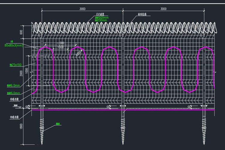 7.山区边境拦阻铁丝网采用高温浸塑型钢板网围栏防护网,围栏防护网规格~2.6X3m (三道加强弯),丝径6.0mm (塑后),网孔75*150mm。围栏地上部分采用80X80X3mm(高2米)立柱,间距3m,防护网必须由施工单位现场根据实际地形确定订货尺寸,需经建设单位批准。
