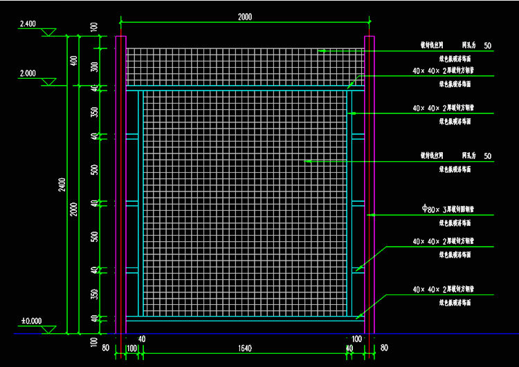 2、边框,40*40*2mm厚镀锌方钢管,绿色氟碳漆饰面。