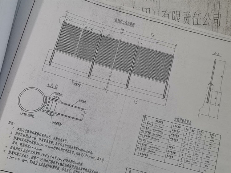 3、防抛网采用网丝规格为15x15x2.5mm的镀锌钢丝浸塑处理,网眼不大于0.25cm2,颜色为绿色,镀层厚度0.4~0.8mm。