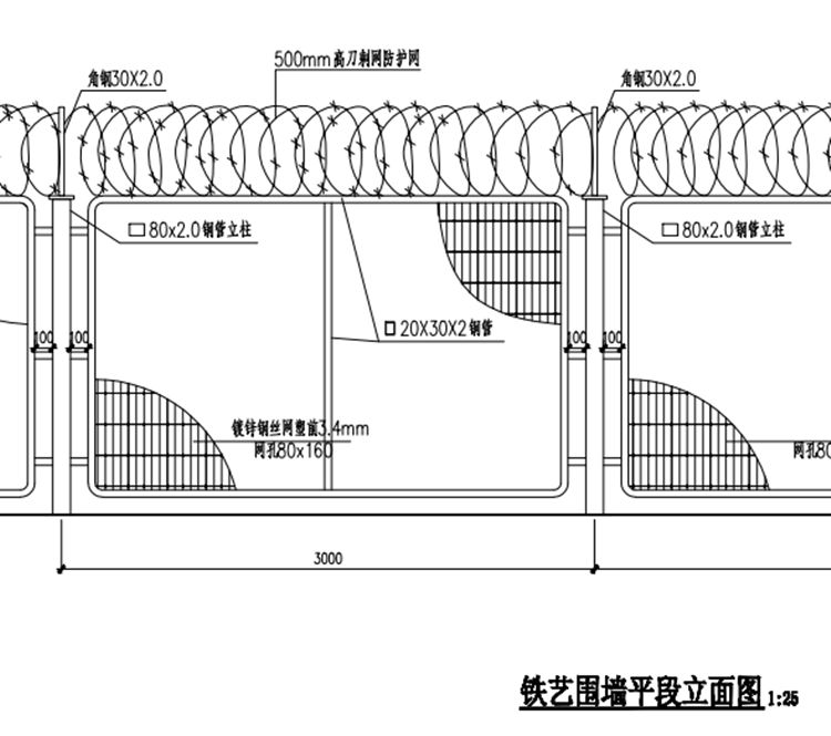 水渠河道铁艺围墙一般介绍:1、立柱规格,方管80*80*2.0mm;2、边框规格,方管20*30*2.0mm;3、网孔规格,80*160mm;4、网丝规格,塑前3.4mm;5、刀片规格,Φ500mm;6、支架规格,角钢30*30*2.0mm;7、防腐工艺,热浸塑绿色防腐;8、安装尺寸,2.3*3米。