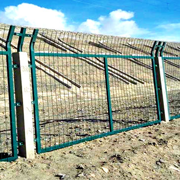 3、金属网片应整体镀锌浸塑处理,镀锌量270g/㎡, 厚度0.8mm~1.2mm,颜色为墨绿色。涂层均匀,颜色一致,表面光滑,无流柱、滴瘤、粉泡、龟裂、漏铁、等缺陷。网片制造精度要求:长度误差≤2.5mm,高度误差≤3.0mm。网面平整度要求:凸起或凹进值≤5.0mm。冷拔钢丝镀锌前直径误差<0.06mm。焊接网孔误差≤3.0mm。