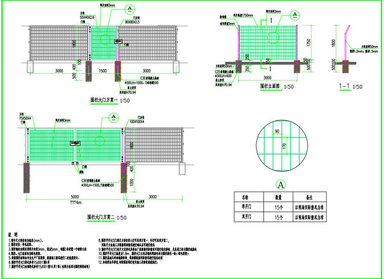 6、围栏皮隔开大门门洞尺寸若仅作人行可采用方案一,车行可采用方案二,实际尺寸由施工方根据现场情况进行确认后可进行优化。