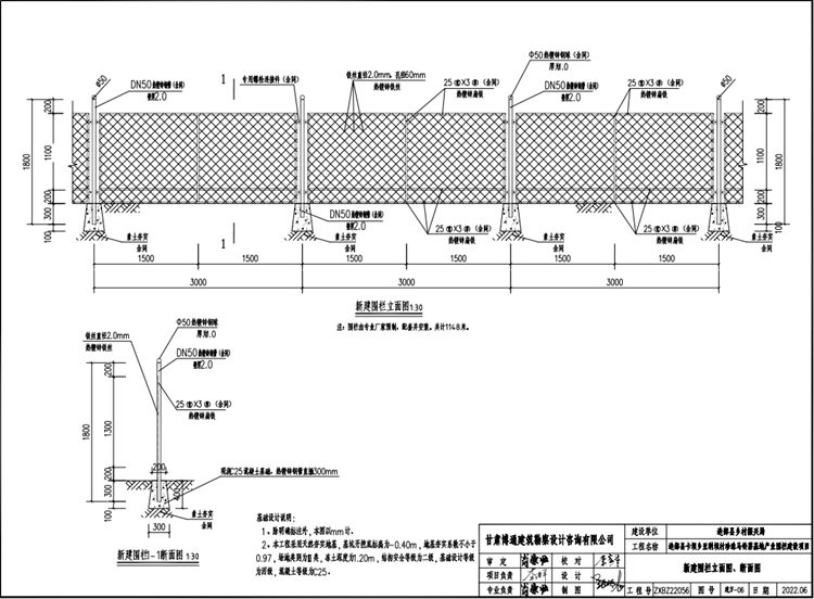 5、新建围栏整体高度1.8米,包含预埋地下30公分,围栏立柱中心间距为3.0米,新建围栏总长度为1148米。