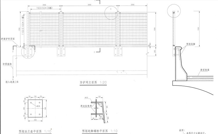 4、施工中,必须确保预埋地脚与护拦主筋的连接。设计中,预埋地脚故意超长并且设弯钩,主要目的在于方便施工中预埋地脚与护栏主筋的连接。