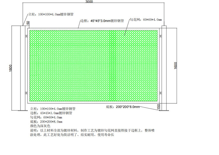 2、边框规格45*45*3.0mm镀锌钢管。
