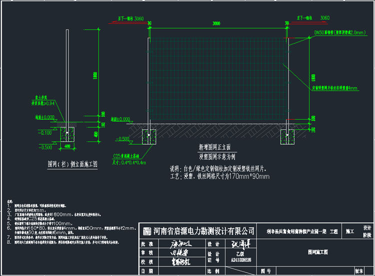 1.浸塑铁丝网围网坐标见道路布置图,可根据现场情况适当调整。