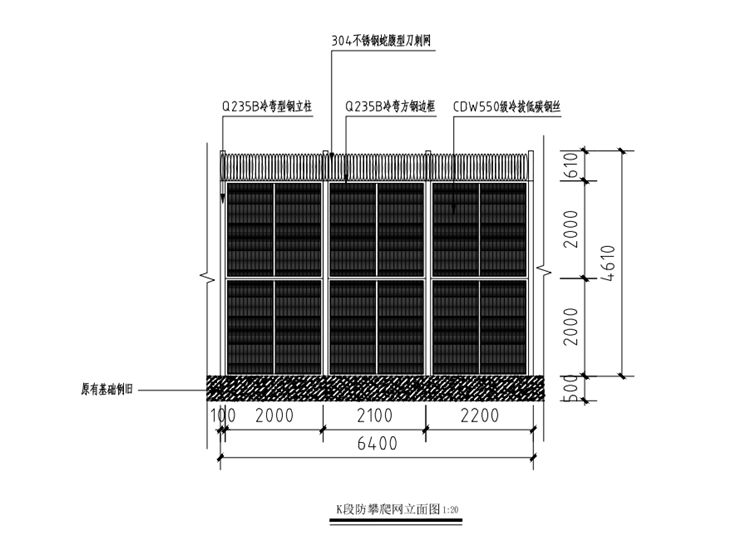 立柱材质为Q235B冷弯型钢,边长100mm,壁厚4mm,间距2000mm;边框材质为Q235B冷弯方钢,边长50mm,壁厚2mm;钢丝焊接网材质为CDW550冷拔低碳钢丝,网孔间距横向为100mm,竖向间距为