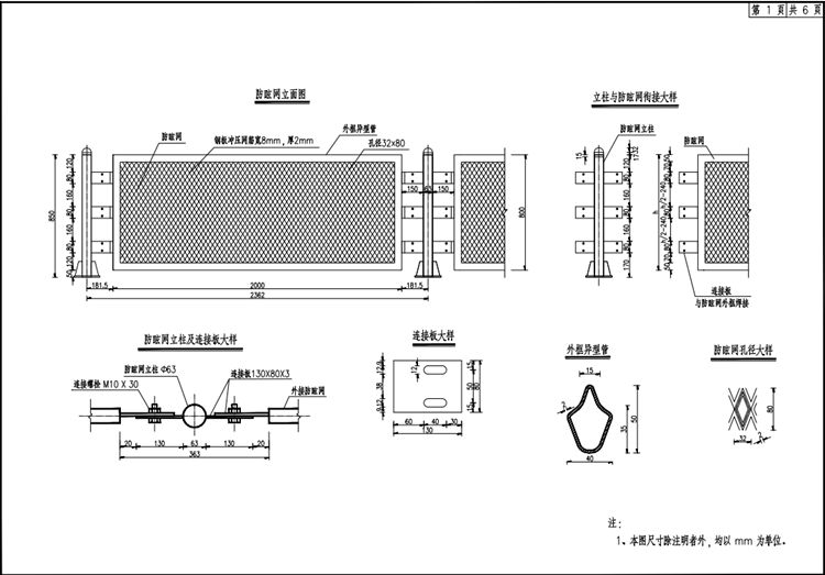 1.本图尺寸除注明者外均以mm为单位。2.防眩网每12m断开一次,断开处立柱间距为210~250mm(中心距),避免受台风影响成片倒塌 ,断开位置立柱脚之间采用Φ5铜线捆绑连接,进行防雷接地处理。3.防眩网与外框钢管焊接成整体结构。板材采用Q235低碳钢,冲压成型。螺栓均采用8.8级大六角头高强螺栓,采用防盗螺栓, M10X30螺栓采用全螺纹,头部高度为6.4mm。4.所有钢构件除注明者外均采用Q235钢制作并进行防腐处理。防腐要求应按照《公路交通工程钢构件防腐技术条件》( GB/T 18226-2015)执行。钢管、钢板、钢带,平均镀锌层附着量不低于600g/㎡,平均镀锌层厚度不低于0.084mm;紧固件, 平均镀锌层附着量不低于350g/㎡,平均镀锌层厚度不低于0.049mm,镀层应均匀,镀层均匀性不低于25%。5.焊缝等级要求:焊缝质量等级不低于二级。侧壁钢板与法兰盘、钢管与法兰盘间焊接采用满焊焊透;所有焊缝应连续焊接并平滑过渡,所有加劲肋焊缝应双面满焊。6.化学锚栓M12x150中心距混凝土边距c应不小于96mm ,两螺栓中心间距应不小于120mm。7.钻孔时须保证钻机、钻头与植入钢筋的受拉方向一致,保证孔径与孔深尺寸准确。8.钻孔应避开钢筋特别是预应力筋和受力筋。钻孔时,如果钻机突然停止或钻头不前进时,应立即停止钻孔,检查是否碰到内部钢筋。对于失败孔,应填满化学粘结剂或高一个强度等级的水泥砂浆,另选新孔。9、植筋施工工艺严格按照:定位、钻孔、清孔、钢材除锈、注胶、植筋、固化进行。10.施工工艺等应符合JGJ145-2004《混凝土结构后锚固技术规程》相关要求。11.不同材质的金属构件互相接触时,应使用非金属套、垫或?;げ闶沽秸吒衾?。12.接地电阻必须小于10Ω ,根据土壤电阻率等实际情况确定接地圆钢和接地角钢的数量,所需工程量按实际计量。防雷接地应满足《建筑电气工程施工质量验收规范》( GB 50303)要求。13.工程数量表仅供参考,具体数量据实计量.其他未尽事项应按现行有关规范、标准执行。