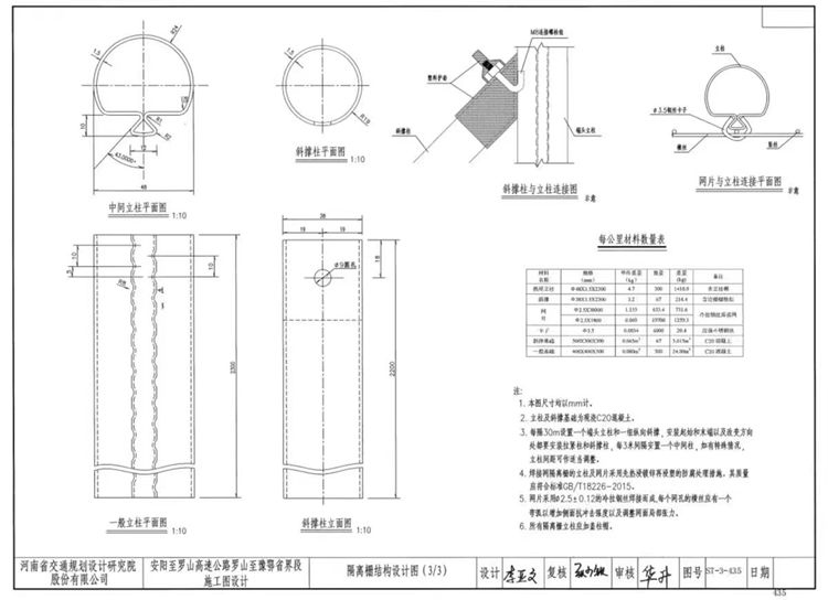 3.每隔30m设置一个端头立柱和一组纵向斜撑,安装起始和末端以及改变方向处都要安装拉紧柱和斜撑柱。每3米间隔安置一个中间柱,如有特殊情况,立柱间距可作适当调整。
