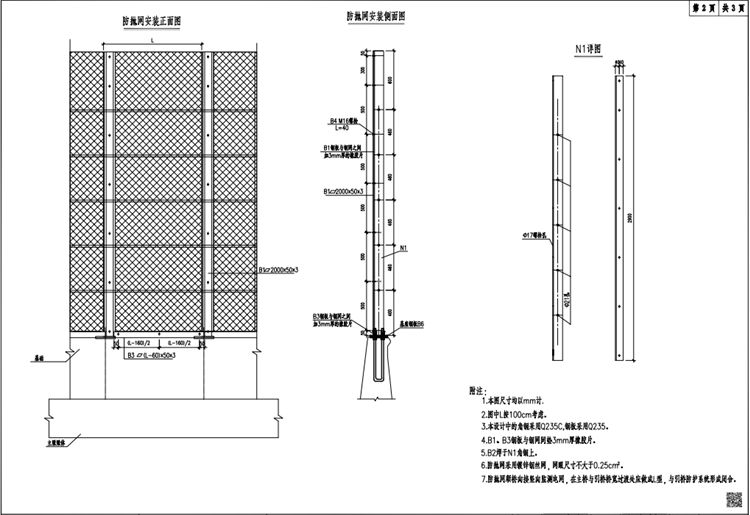 跨高铁特大桥防异物防护网设计要求1.本图尺寸均以mm计。2.图中L按100cm考虑。3.本设计中的角钢采用Q235C ,钢板采用Q235。4.B1、B3钢板与钢网间垫3mm厚橡胶片。5.B2焊于N1角钢上。6.防抛网采用镀锌钢丝网,网眼尺寸不大于0.25平方厘米。7.防抛网顺桥向接竖向监测电网,在主桥与引桥桥宽过渡处应做成L型,与引桥防护系统形成闭合。