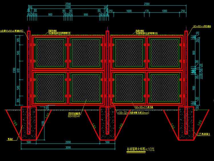 3.本工程内所有铁件除特殊说明外均为Q235低碳钢,围网网面及立柱等防腐采用热镀锌270g/㎡,喷塑100μm,喷塑材料:纯聚酯室外静电粉末,螺栓采用304不锈钢。颜色暂定采用灰色(色号RCB :89 102 ,111,实物颜色以各方确认为准)。