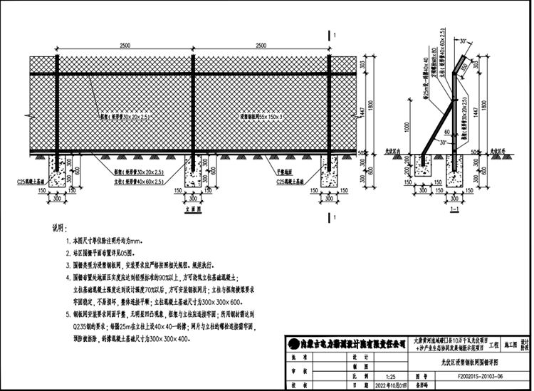 1.本图光伏区钢板网围栅尺寸单位除注明外均为mm。