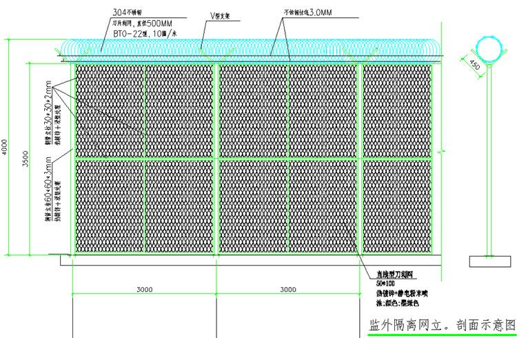 10、监狱隔离网的顶部应设道蛇腹型刀刺网, 蛇腹型刀刺网材质宜为304不锈钢, 刀片形式宜为BT0-22。