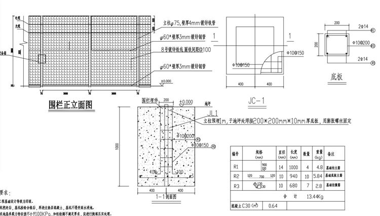 3、热镀锌围栏基础钢筋笼底板主筋采用Φ10@150,基础钢筋笼纵向主筋采用Φ10@150,基础钢筋笼箍筋采用Φ 10@200。