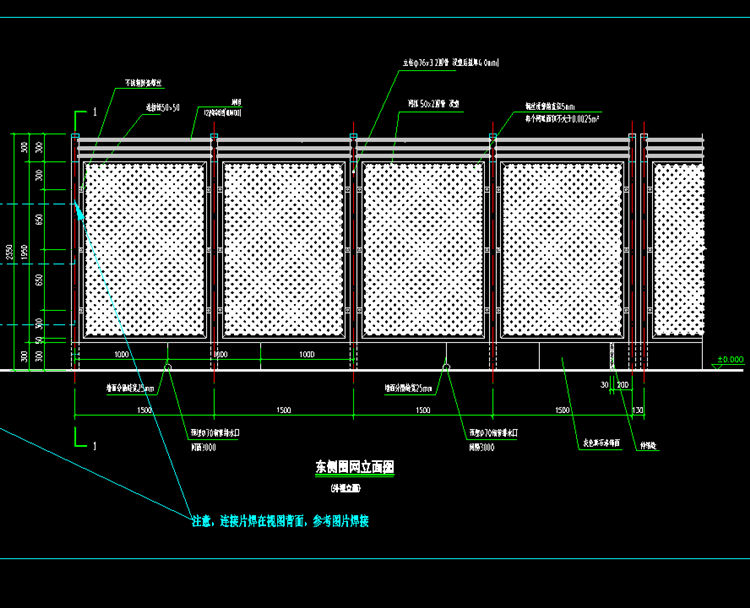 (3)围网立柱间距1.5m,采用电焊管其化学成分及机械性能应符合有关规定,焊接部位要求过度圆滑,无夹缝,无虚焊,无气孔等缺陷。
