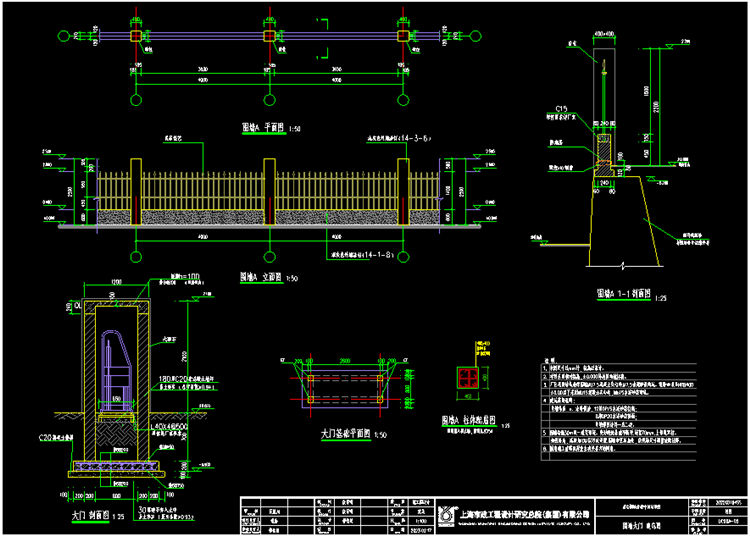 1. 本图铸铁透视围墙尺寸以mm计,标高以米计。