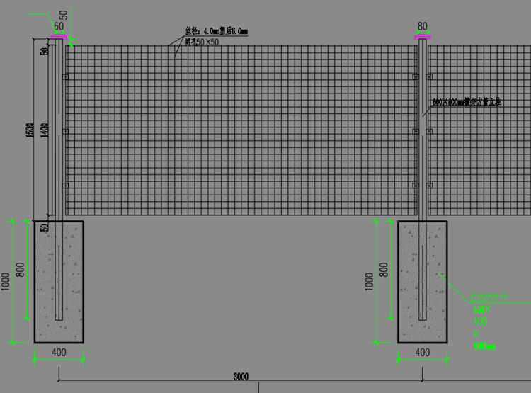 4.钢丝网防护网立柱基础混凝土尺寸为400x400x1000,局部遇浅坑处应对地面进行平整。