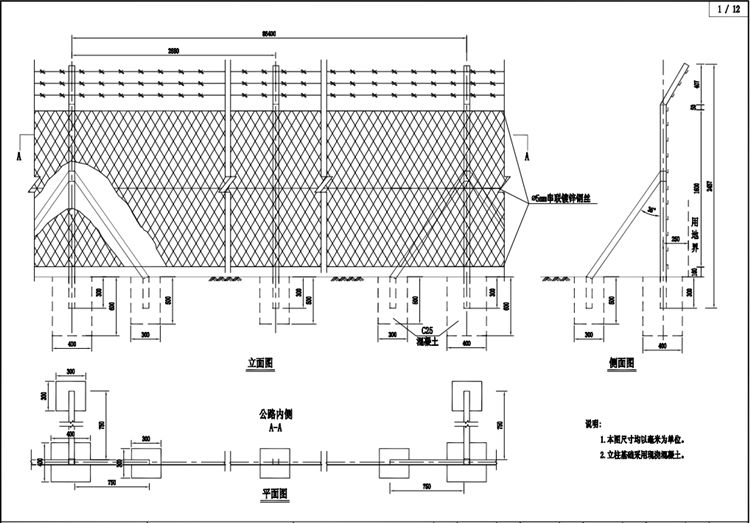 2.勾花网护栏网沿公路用地界布置,立柱在用地界内侧25cm处。