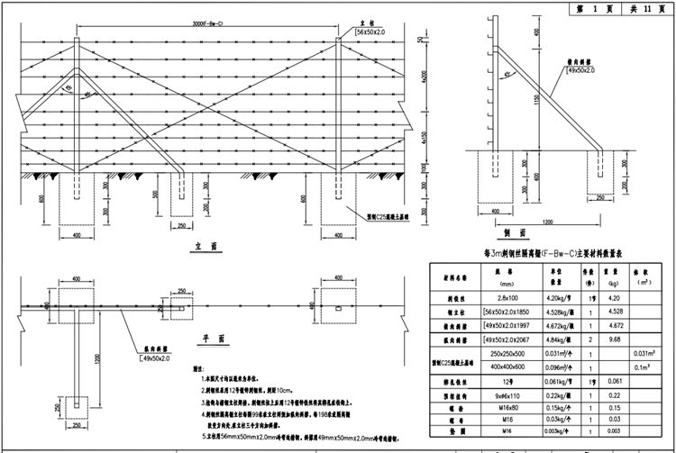 5.刺钢丝隔离栅立柱采用56×50×2.0×1850mm槽钢,斜撑选用49X50X2.5冷弯等边槽钢。刺钢丝隔离栅热镀锌喷塑防腐处理,钢构件镀锌量为 275g/㎡,涂塑层厚度大于76μm。立柱安装间距设置为3m。刺钢丝采用12号镀锌钢丝,刺钢丝镀锌量为 120g/㎡。刺丝间距4×15+4×20?;』炷廖狢30,尺寸400×400×600。按新规范增加刺钢丝隔离栅小门。