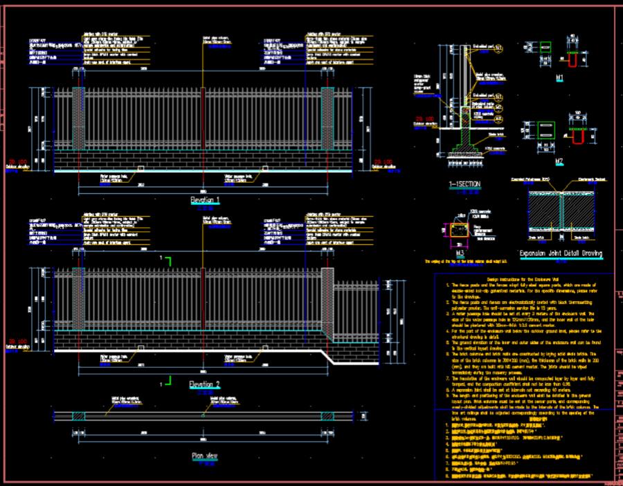 围墙长度及定位详总图,拐角部位必设砖柱,并对砖柱间隔作相应均分调整。铁艺栏杆根据砖柱间距作对应调整。