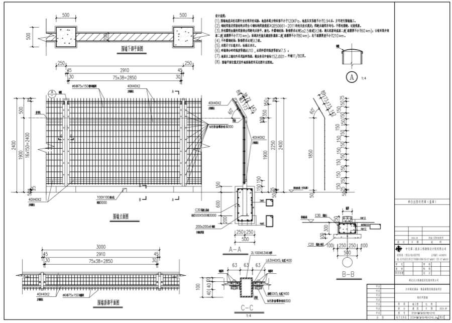 (1).围墙地基应经总图专业处理并经试验,地基承载力特征值不小于120KPa、地基压实系数不小于0.94后,方可进行围墙施工。