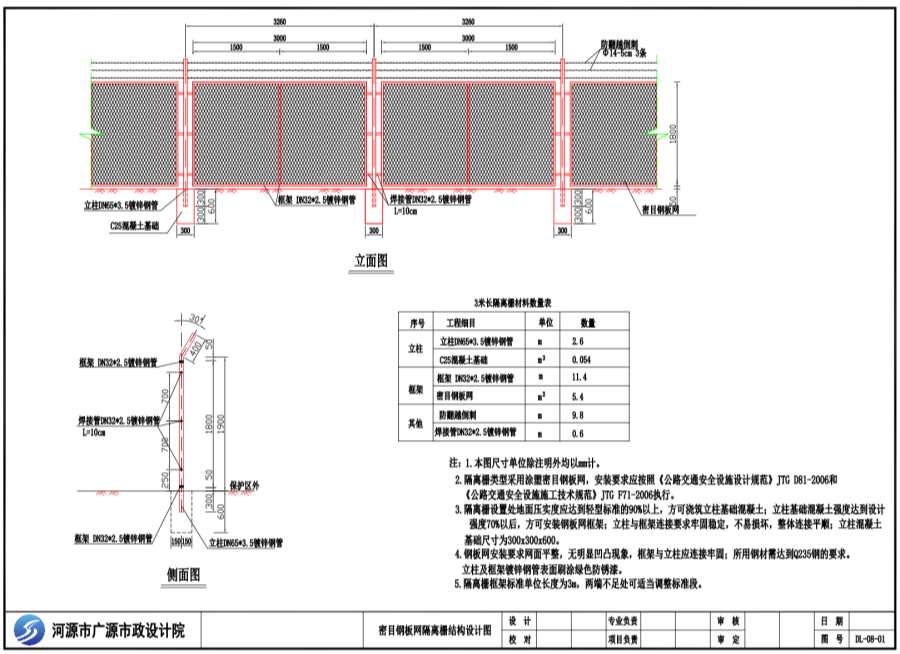 2.隔离栅类型采用涂塑密目钢板网,安装要求应按照《公路交通安全设施设计规范》JTG D81-2006和《公路交通安全设施施工术规范》JTG F71-2006执行。