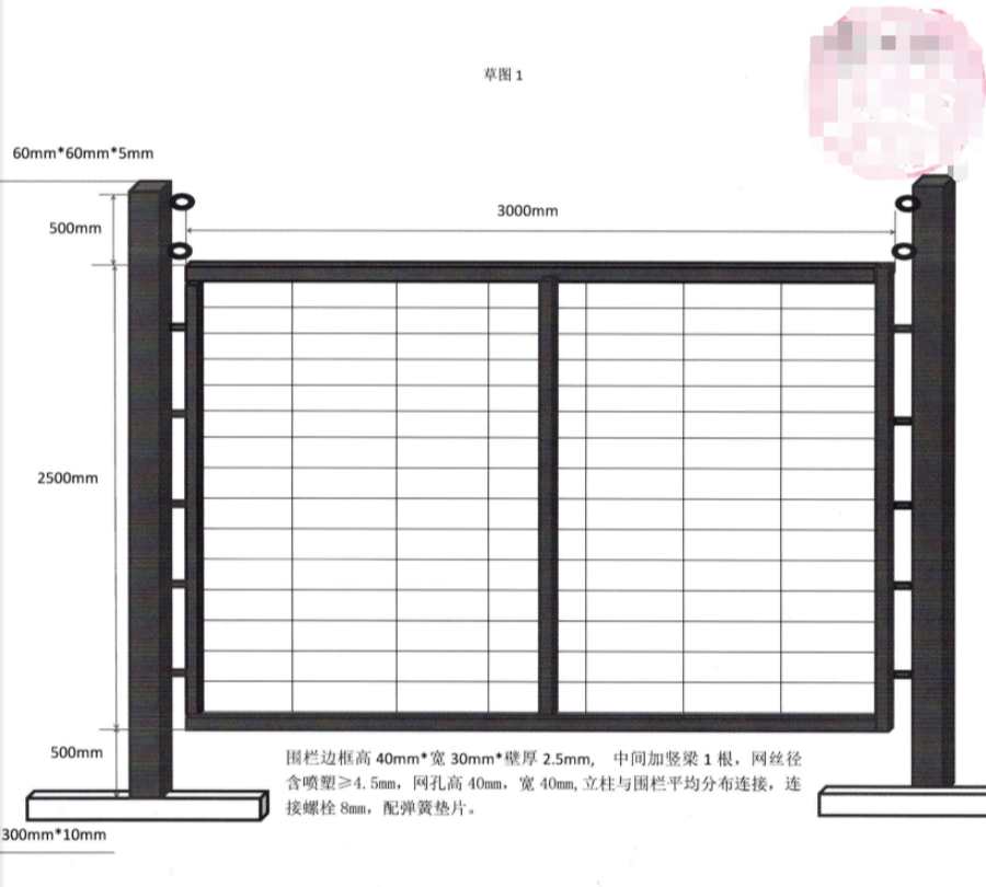 2.活动围栏具体规格3000mmX2500mm(宽1500mm 处加装竖梁一根),围栏孔径40mmX40mm,钢丝喷塑后不小于4.5mm,围栏四周方钢边框尺寸为 30mmX40mmX2.5mm(40mm 为边框正面高度)。(见草图 1)