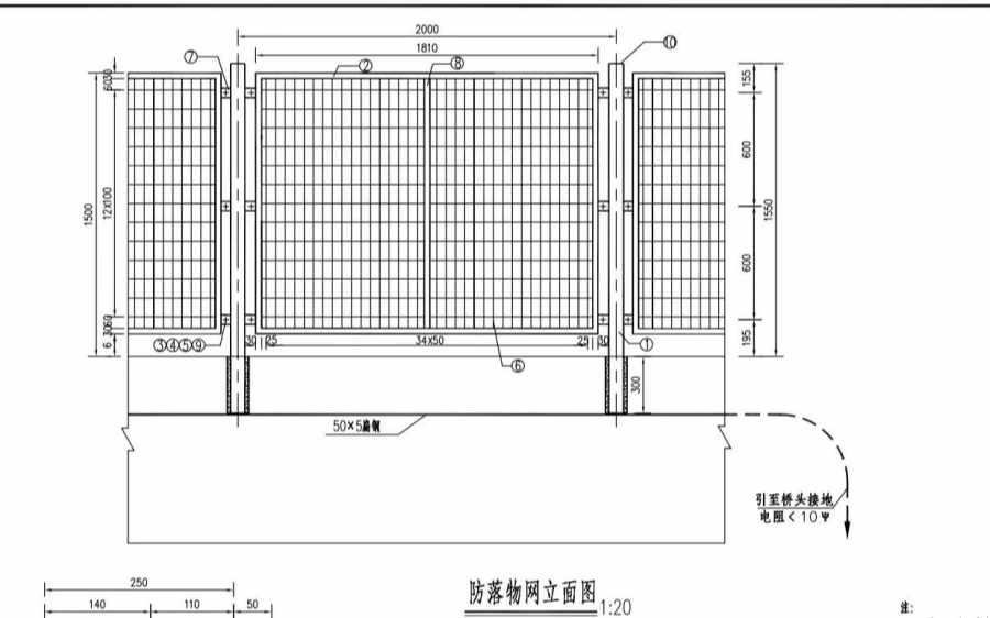 2.本图适合于防落物网设在人行天桥或分离式立交桥砼护栏顶上。