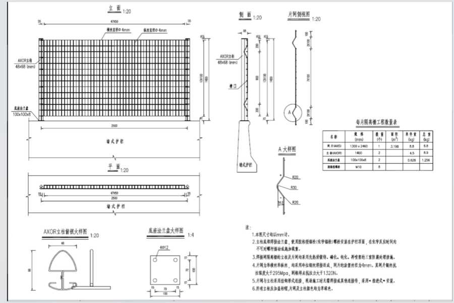 4.片网为单横丝单纵丝,均采用冷拉钢丝焊接而成,网片的涂望丝径为4mm。其网片钢丝抗拉强度大于295Mpa,网格焊点抗拉力大于1320N。