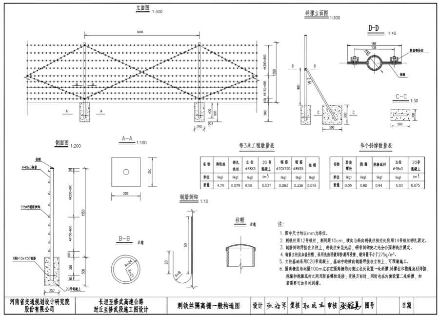 2.刺铁丝用12号铁丝,刺间距10cm,横向与斜向刺铁丝相交处应用14号铁丝绑扎固定。