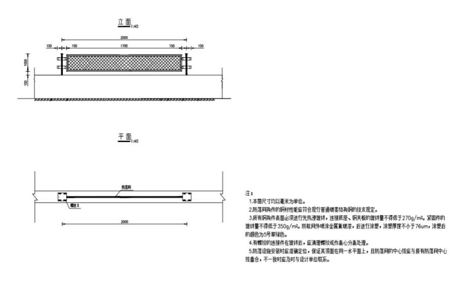 3.所有钢构件表面必须进行先热浸镀锌,连接底座、钢夹板的镀锌量不得低于270g/㎡。紧固件的镀锌量不得低于350g/㎡。防眩网外喷涂金属氟碳漆,后进行涂塑,涂塑厚度不小于76um,涂塑后的颜色为5号翠绿色。